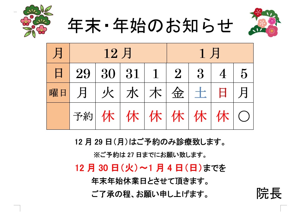 年末年始のお知らせ 12月30日(火)~1月4日(日)までを年末年始とさせて頂きます。 29日(月)はご予約のみの診療となります。 当日予約は受付けておりませんので、必ず27日(土)までにご連絡ください。ご了承の程、お願い申しあげます。